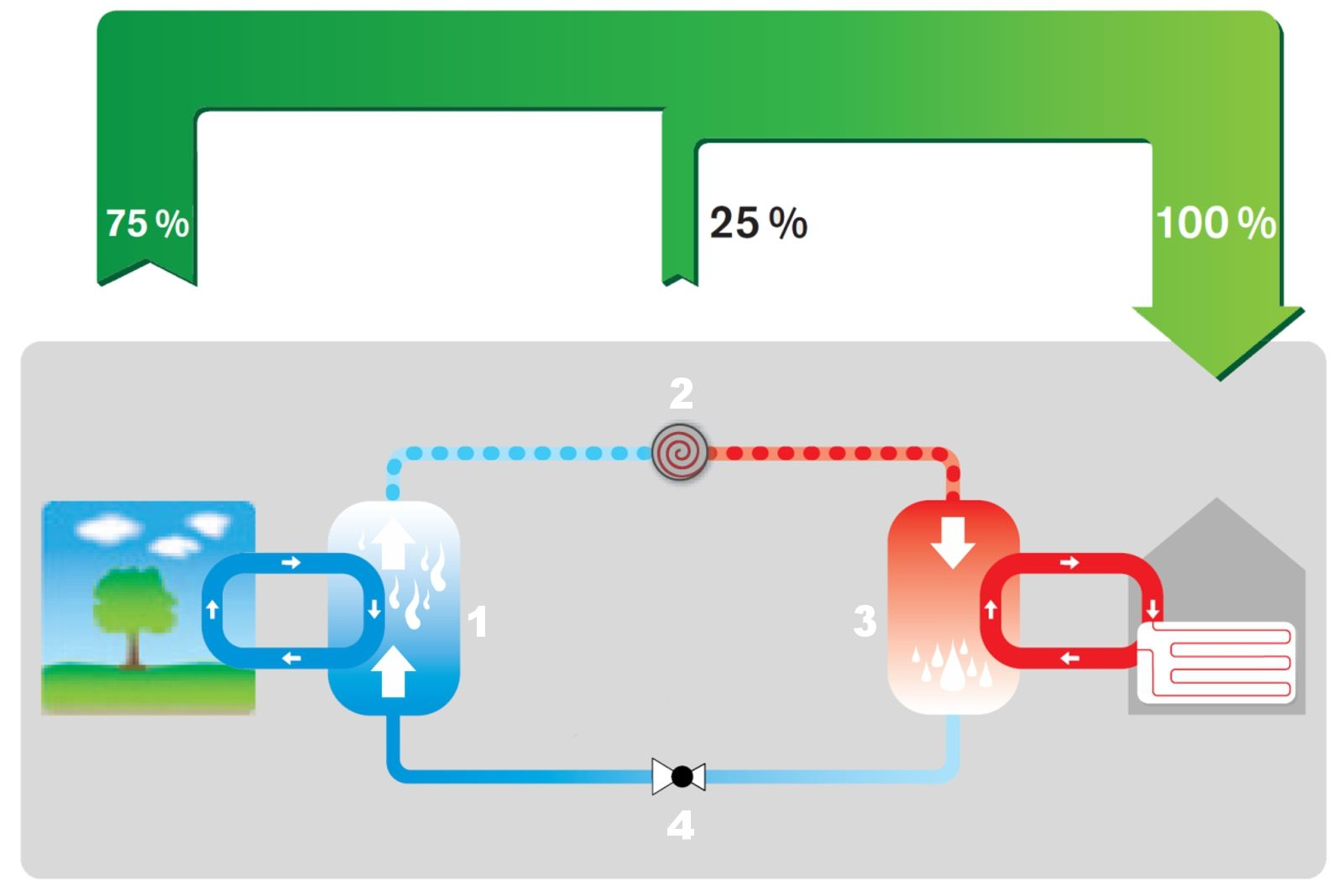 Eine Wärmepumpe nimmt aus der Umwelt - aus Luft, Erde oder Grundwasser - Energie über einen Wärmetauscher auf und überträgt diese Energie an das Kältemittel im Kältekreislauf. Dadurch erwärmt sich das Kältemittel und wird verdampft, weshalb dieser Wärmetauscher Verdampfer (1) genannt wird. Im dampfförmigen Zustand wird der Druck des Kältemittels mithilfe elektrischer Energie über den Verdichter (2) erhöht d. h. zusammengedrückt. Dadurch wird das Kältemittel nochmals erwärmt. Das Kältemittel gibt diese Wärme über den Wärmetauscher an den Heizkreis ab. Dieser Wärmetauscher wird Verflüssiger (3) genannt, da der Hauptanteil der übertragenen Energie durch Kondensation gewonnen wird. Das jetzt flüssige, kältere und noch unter Druck stehende Kältemittel wird über ein Expansionsventil (4) wieder entspannt und auf die wärmeaufnehmende Seite der Wärmepumpe geführt. Damit schließt sich der Kältekreislauf und beginnt von Neuem.